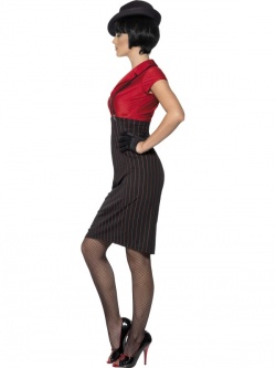 Kostým Gansterka zahrnuje červenou košili, vysokou černou sukni s pruhem a kšandami, rukavičky.