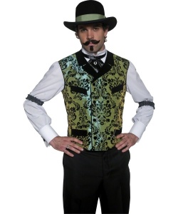 Tento kostým hráče karet z divokého západu je tvořen luxusní prošívanou vestou s bílými rukávy od košile, ozdobným černým nařaseným límcem a gumičkami na rukávy.