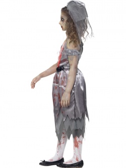 Dětský kostým- Zombie nevěsta, šedobílé krvavé šaty, šedý závoj